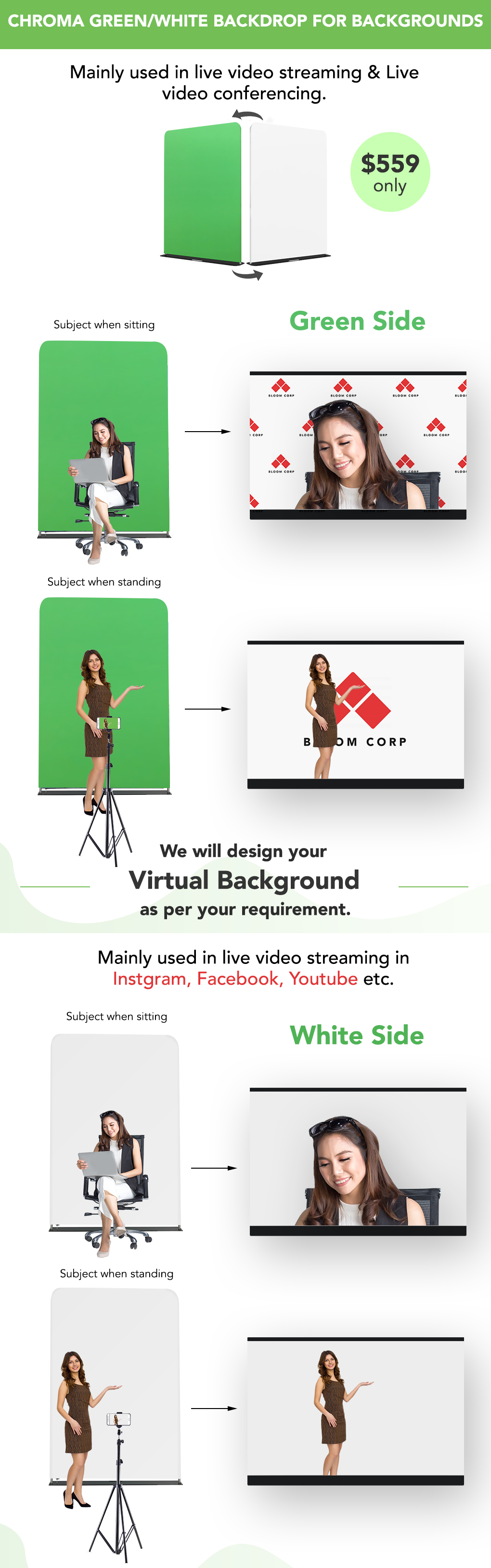 Chroma Green/White Backdrop for Backgrounds (Size 2m wide x 2.3m high)
